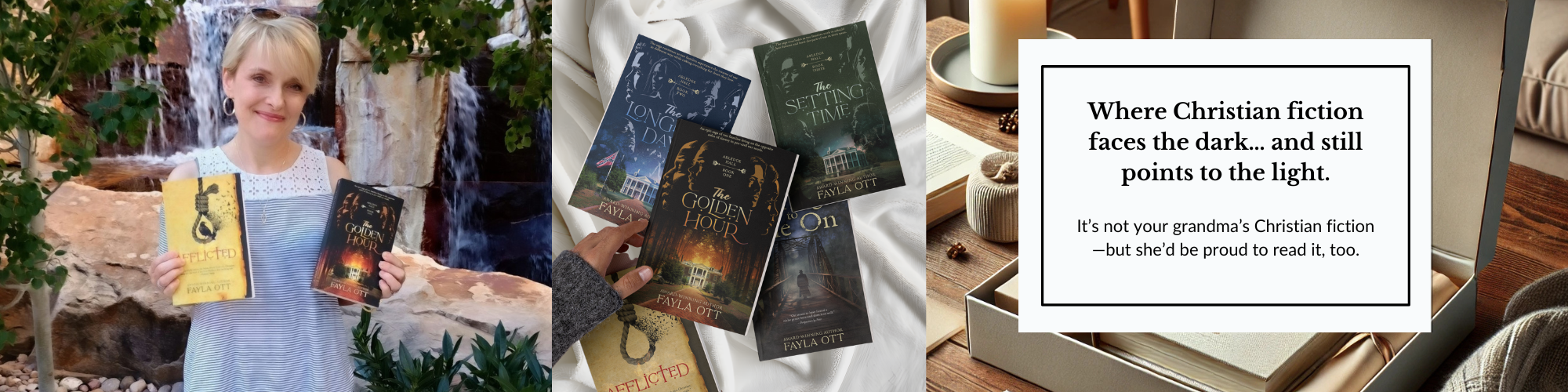 Southern by birth and storyteller by calling, Fayla Ott writes novels steeped in the grit and grace of the Deep South. Whether crafting sweeping historical dramas or edge-of-your-seat supernatural thrillers, her stories wrestle with the broken and the haunted, always leaving room for hope and grace to shine through.